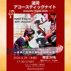 ●神戸淡河町 dannapan(神戸市北区淡河町木津22) ●Start 17:30 / Live 18:00~(2set)/ Close 20:00 ●Charge: ¥6,600(限定30名) イベント当日、チケット […]